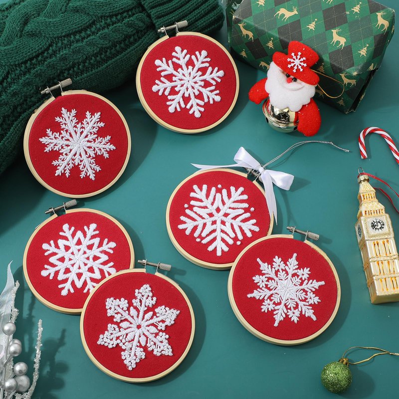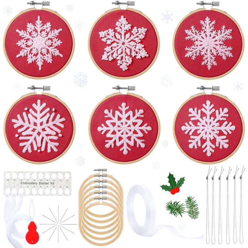 6 Sets Winter Embroidery Kit for Beginners Snowflakes Christmas Cross DIY Needlepoint Kit with Patterns, Instructions, Embroidery Hoops, Threads, Needles, Needle Threader, Ropes, Ribbon (Red)