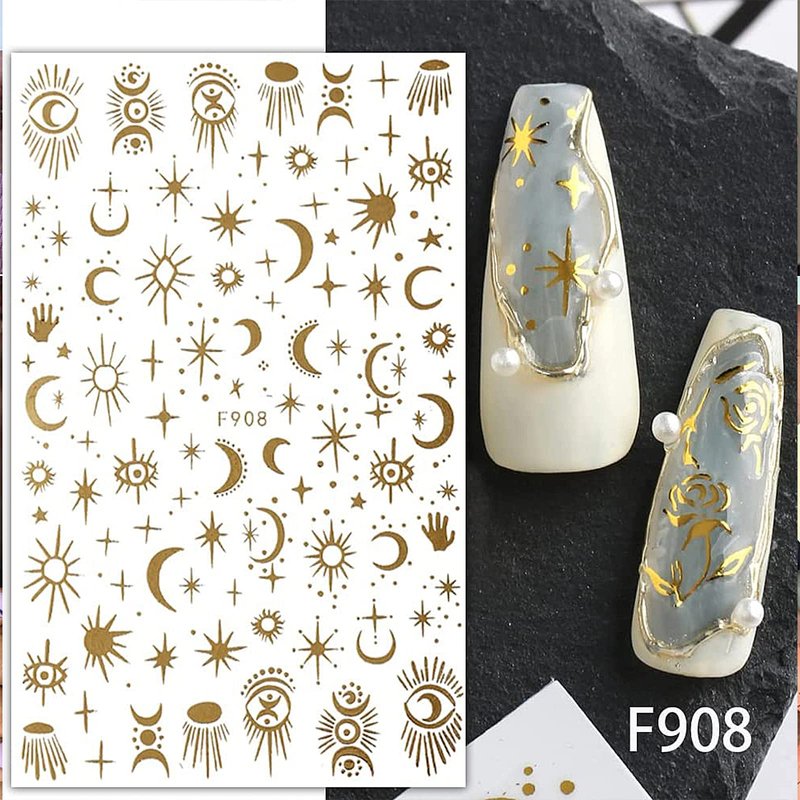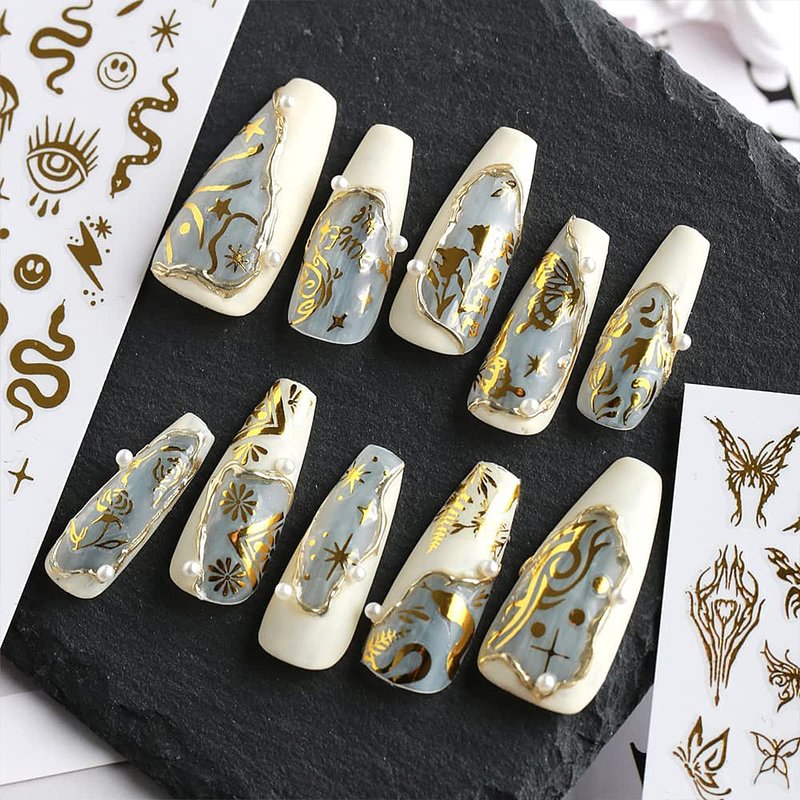 6 Sheet Gold Nail Stickers Black Snake Eyes Leaf Nail Art Stickers 3D Self-Adhesive Bronzing Sun Star Decals Starlight Nail Design Stickers for Acrylic Nail Supplies Women Nail Decorations