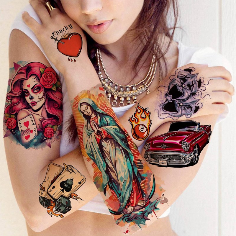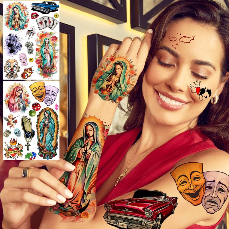 - đă6 Sheets Groovy 3D Chicano Halloween Temporary Tattoo StickersăFANRUI Unique Design Our Lady Of Guadalupe Temporary Tattoos For Women Realistic Chicana Chicano Tattoos Gansta, Dice, Dollar, Laugh now, Cry Later, Lowrider, Bills, Chips, Car, Vehicles, Payasa, Gambler, Virgin Mary, Prayer, Mexico Mexican Culture, Familia, Cross, Religion, Halloween Costume Accessories Prison Rapper Ghost Prisoner Gothic Stickers Tattos.ăSizeă6 Sheets Large Fake Tattoos For Women 8.2"x5.9".