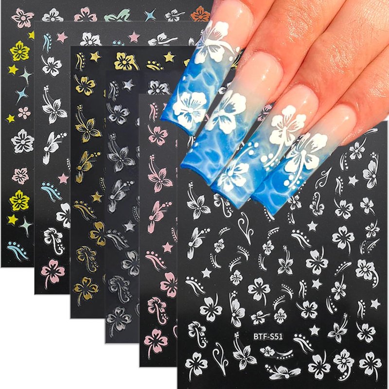 6 Sheets Flower Nail Stickers 3D Self-Adhesive Hibiscus Nail Art Stickers White Pink Gold Spring Floral Nail Supplies Summer Hibiscus Flower Nail Decals for Women DIY Acrylic Nail Manicure Decoration