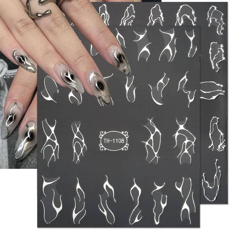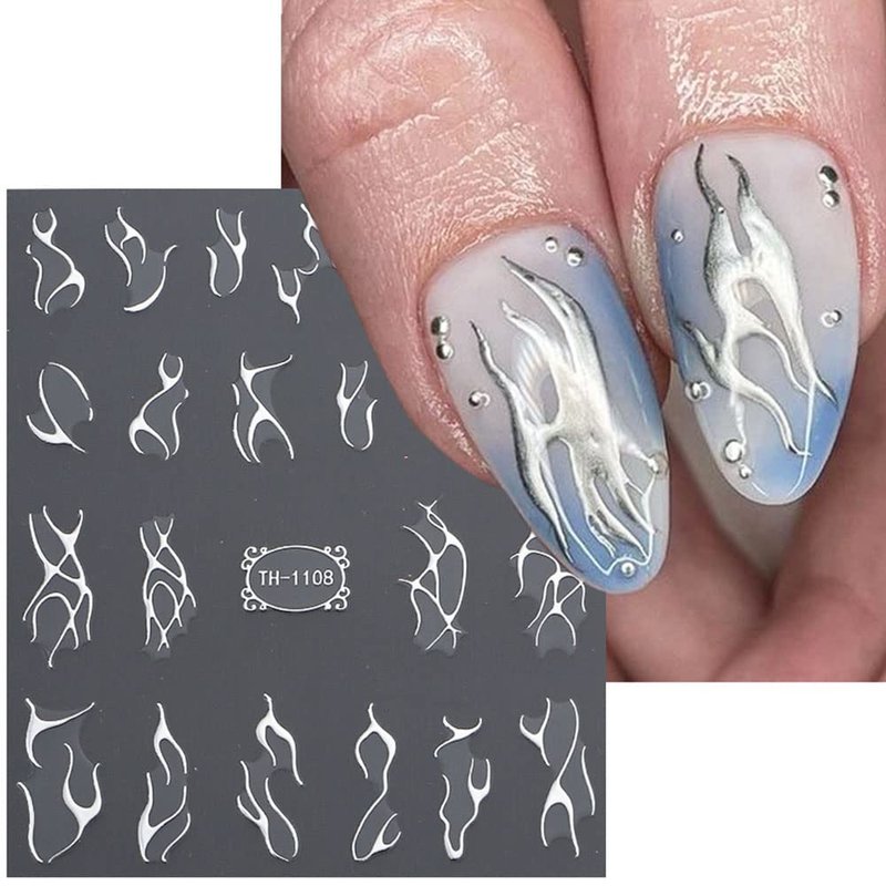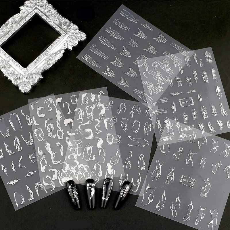 6 Sheets Metallic Silver Lines Nail Stickers,3D Wave Lines Nail Art Stickers Irregular French Line Marble Nail Decals Metal Strip Silver Nail Sticker Adhesive Stickers for Nails DIY Nail Supplies