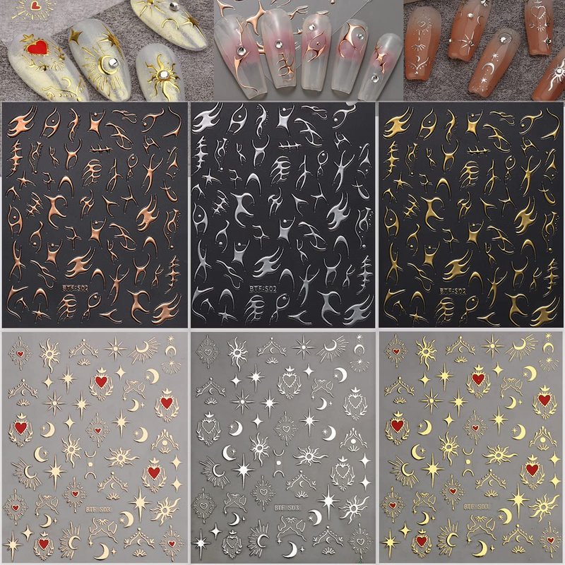 6 Sheets Sun Star Nail Art Stickers Moon Nail Stickers Fish Bone Nail Decals Gold Rose Sliver Fish Bone Moon Star Design Nail Art Supplies for Women Girls Acrylic Nails Decorations Salon Accessories