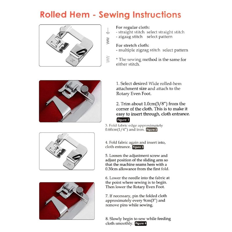 - Rolled Hem Presser Foot Set: 3 Pieces WIDE ROLLED Hem Presser Foot: 4/8" hemmer foot (13mm wide rolled hems), 6/8" hemmer foot (19mm wide rolled hems), 8/8" hemmer foot (25mm wide rolled hems); 3 Pieces NARROW ROLLED Hem Presser Foot: 6mm, 4mm and 3mm rolled hem presser foot, Roll fabric edge and hem stitch at the same time.
