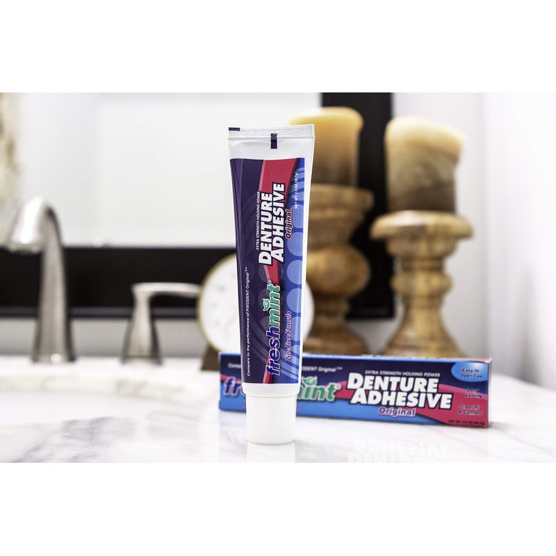 - Oversized Cap and Easy Applicator - Freshmint knows that you have experienced adhesive cream tubes that are bulky and difficult to open. Our tubes were designed with you in mind with an easy to open cap, ooze-control applicator tip and narrowed tube for the simplest application.