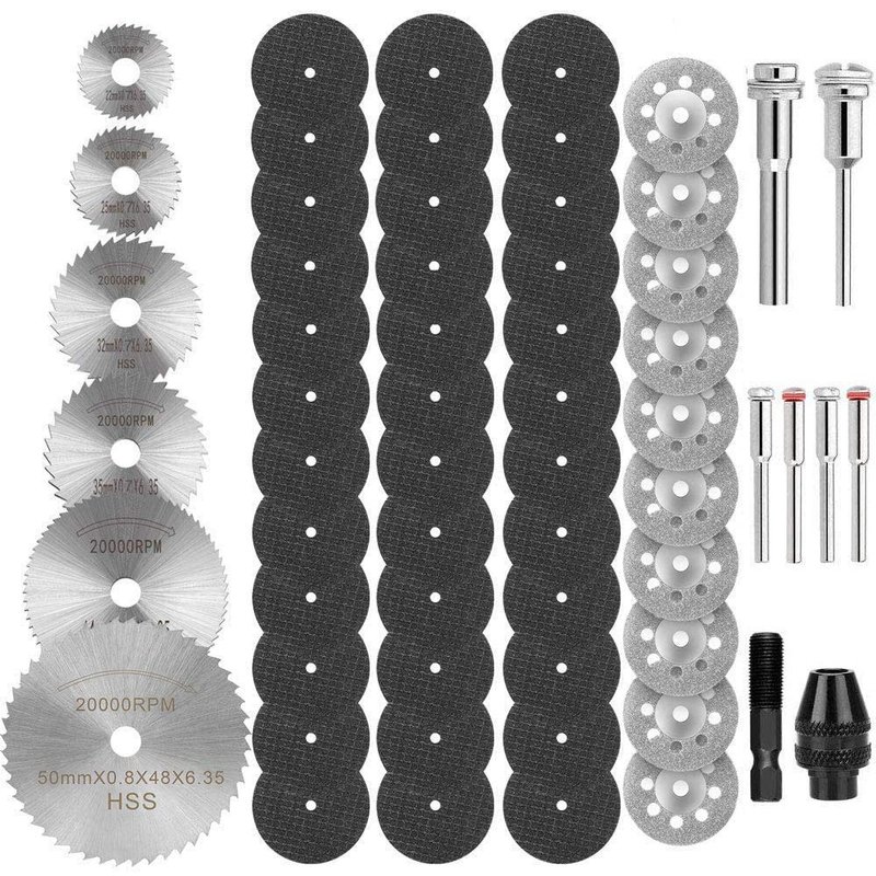 - What You Get: 60-pack Rotary tool mini cutting discs sets include 6 × HSS wood cutting saw blade discs, 10 × Diamond cutting discs wheels, 36 × Resin Cutting Wheel Cut-off Discs, 6 × Mandrels & 1 x Keyless Chuck w/ Hex Shank.