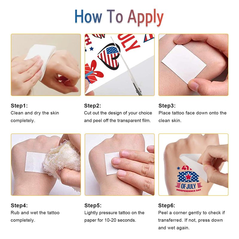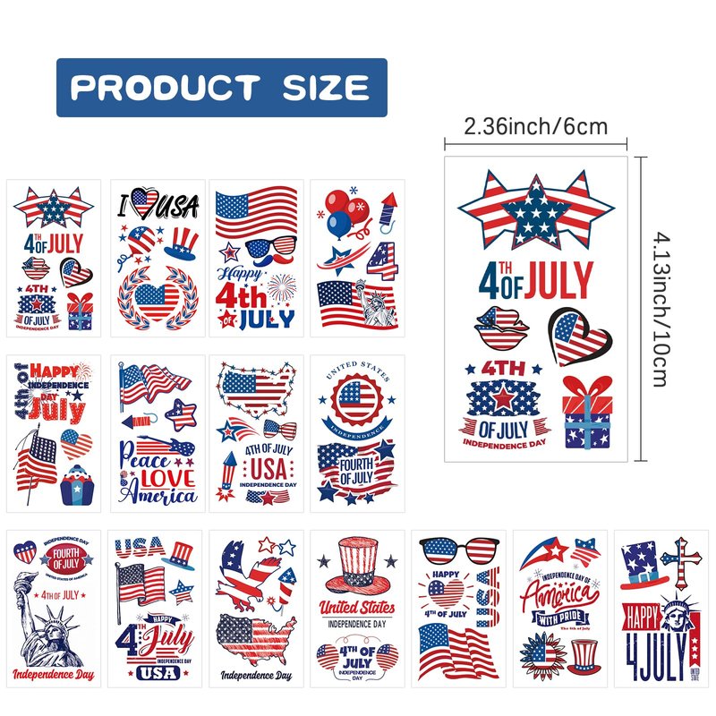 - Independence Day Decorations: Show off your patriotic tattoos anywhere, like arms, wrists, fingers, ankle, neck, shoulder, feet, legs ! In additional use, it's perfect to personalize tattoo stickers for water bottles, laptops, Mac book, skateboards, cars, bumpers, bicycles, bedroom, guitar, travel case, motorcycle, snowboard, etc.