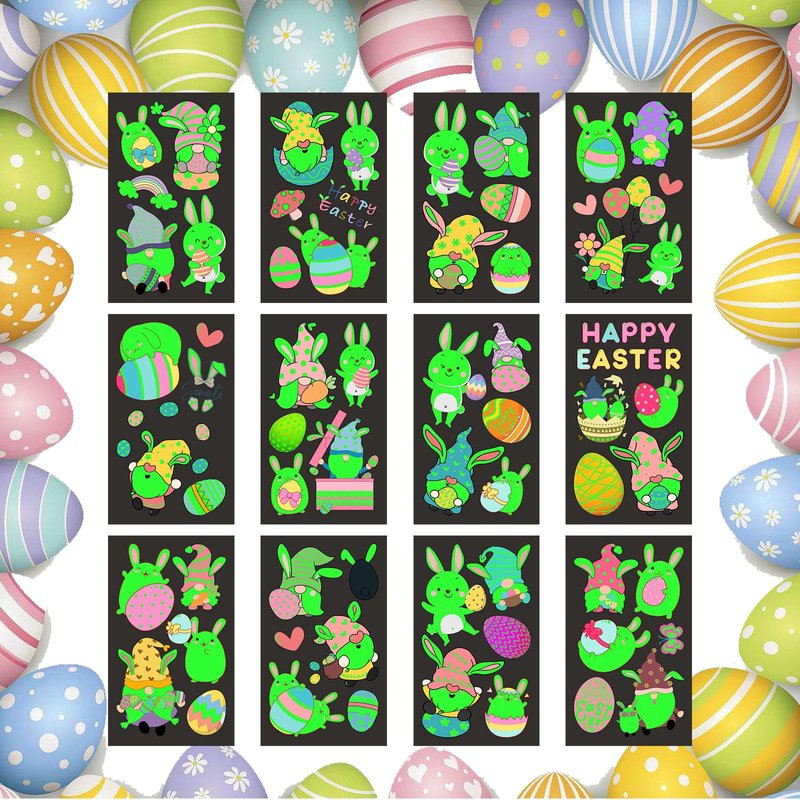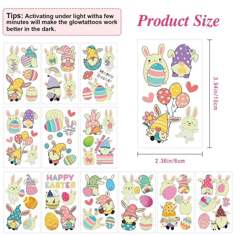 - Easter luminous Temporary Tattoos: 12 sheets cute and vibrant bunny themed tattoos with over 60 pcs designs, feature as Easter eggs, rabbits, dwarfs and other patterns loved by children, attract children, add fun to children's childhood, and can be given as gifts.