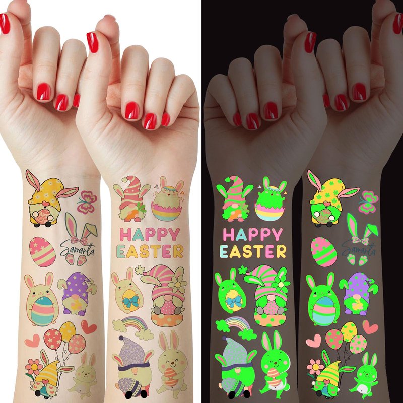 - Glow in the Dark: After absorbing sunlight or illuminating with a flashlight during the day, this tattoo will glow in the dark and makes children have more fun.These Easter luminous stickers need to absorb a few minutes of light before use.