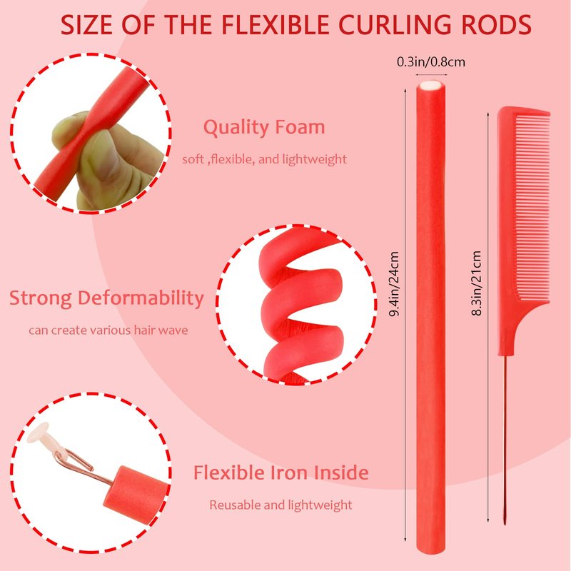 60 Pieces Flexible Curling Rods Twist Foam Flexi Rods No Heat Hair Rods Hair Rollers and Steel Pintail Rat Tail Comb for Long Hair Short Hair Women Girls (9.45 x 0.31, Red)