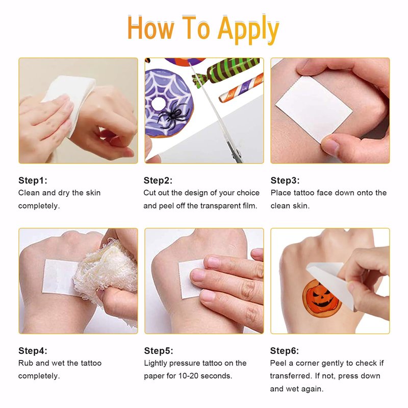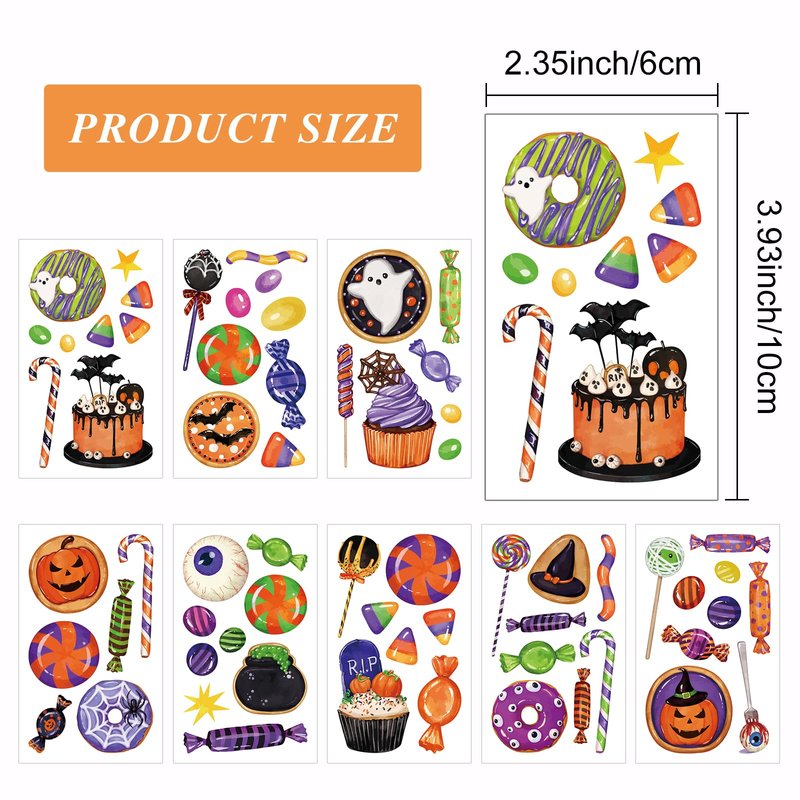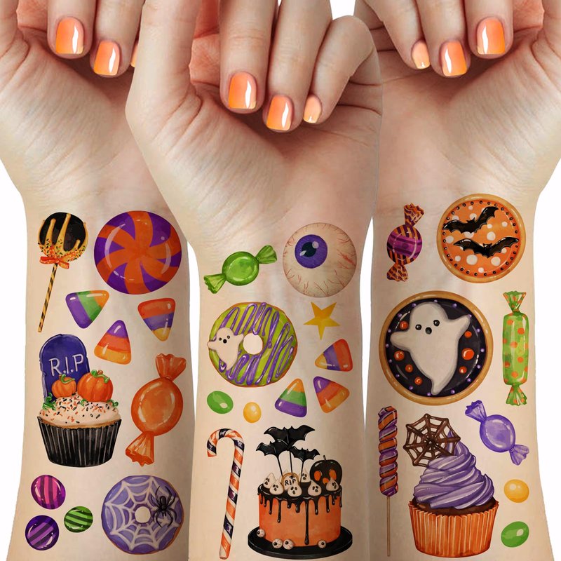 - Halloween Tattoos for Kids: 8 sheets 60pcs halloween temporary tattoos feature in varity Halloween candy patterns, bring you to have a different Halloween time. Sticking these cute tattoos stickers on kids face or body, making your kids be different. Each sheet measures 3.93 x 2.35 inches.