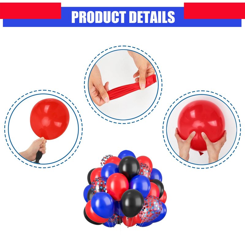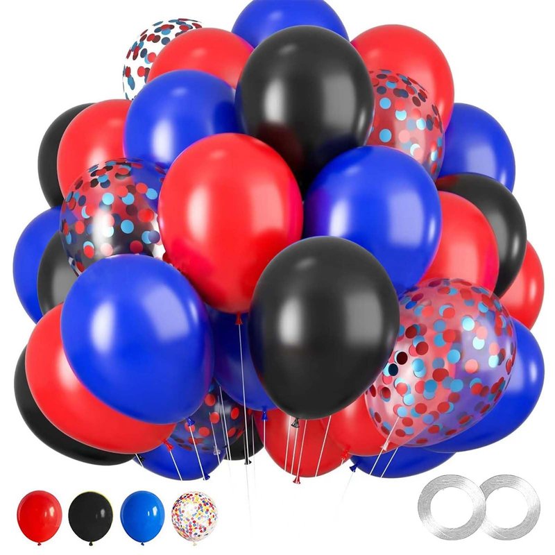 - 【Party Balloons Decorations Set】Our balloon decorations set includes 16PCS 10IN Black Balloons,16PCS 10IN Red Balloons,16PCS 10IN Blue Balloons,12PCS 12IN Blue Red Confetti Balloons,2 rolls of ribbon. The sufficient number of baloon is enough for you to decorate a unique party and make any dull space full of vitality and joy.