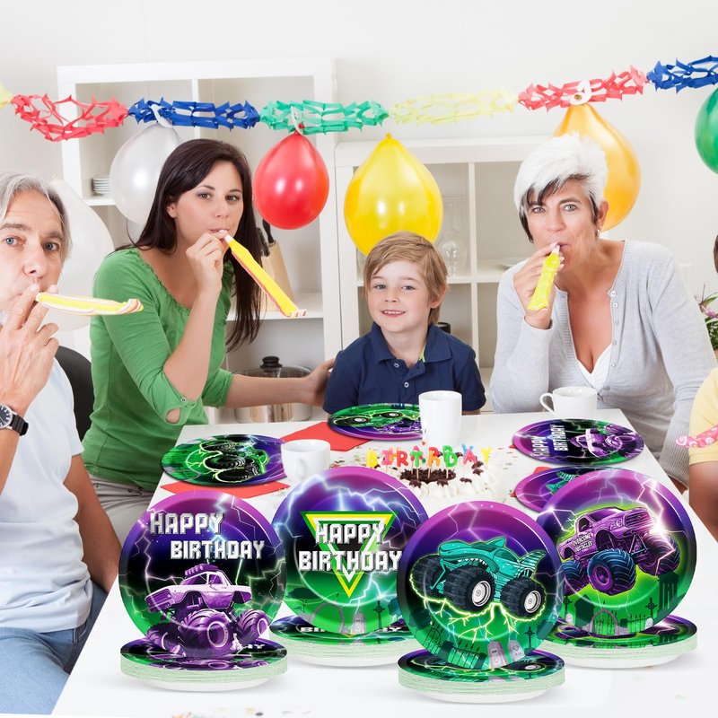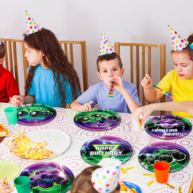 Crafted from high-quality materials, these plates boast a sturdy construction that can withstand the hearty meals and enthusiastic party atmosphere. The green and purple colors, coupled with the dynamic monster truck design, create a festive ambiance that will thrill young party guests and delight parents alike.