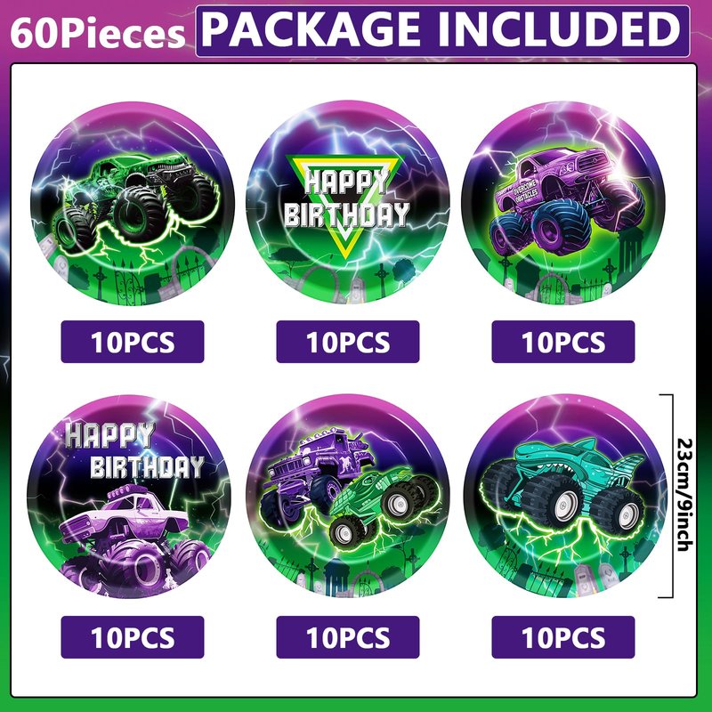 - Package includes: You'll get 60pcs monster truck party paper plates of 9 inches in 6 different designs. Brighten up your table setting with our green and purple monster truck paper plates that exude a playful and celebratory atmosphere, ideal for kid’s birthday party and baby shower.