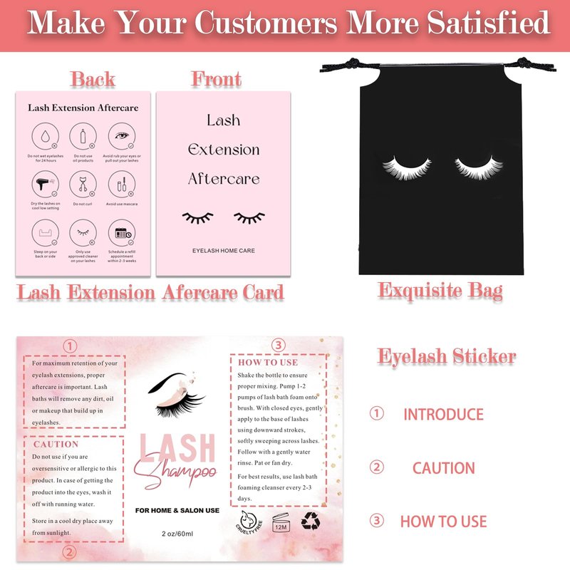 60pcs set 10pcsaftercare bags +10pcs lash extension aftercare instructions cards+10pcs lash shampoo bottles+10pcs lash shampoo stickers +10pcs lash shampoo brushes+10pcs mascara brushes tubes.