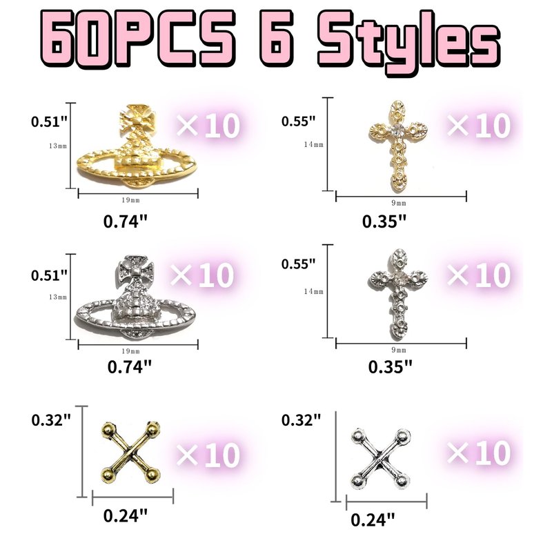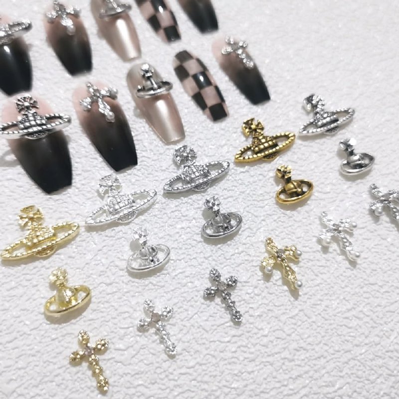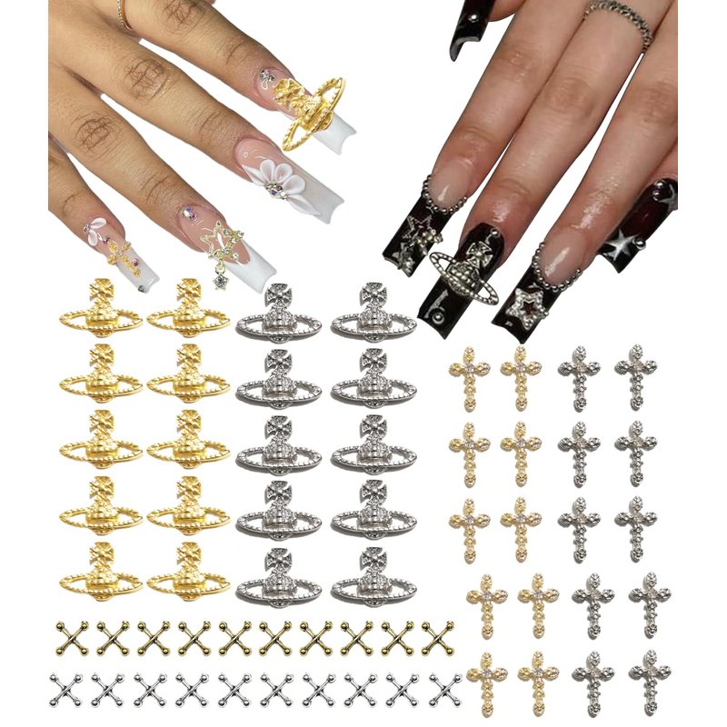- 💎【Nail Supplies Package Contain】60PCS nail accessories contain 20pcs Silver and gold planet nail charms and 40pcs Cross nail charms. Cross nail charm suitable for most natural and fake nails, creating multy-style charming and fashion Y2K nail designs.