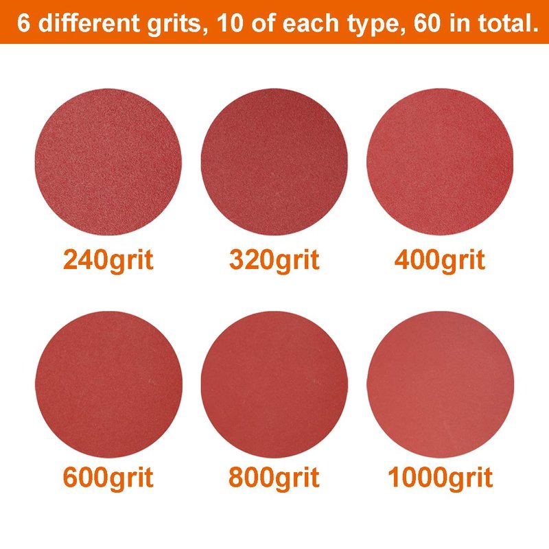 - Package contains 60pcs 6 different grades sanding discs: 1000/800/600/400/320/240 grits, 10 of each type.