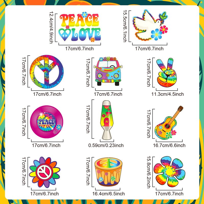 - Suitable size: the size of each retro flower peace sign cutout card is 15 x 15 cm/ 5.9 x 5.9 inches; Each swirl can extend to approx 28 - 36 inch in length; You can hang it anywhere as you like, bring a fun mood to your 60's hippie party