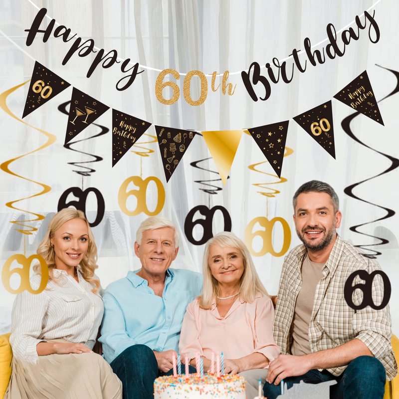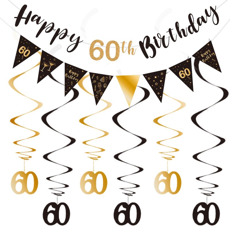 - The package includes: Happy 60th birthday banner(1 set), triangle banner(1 set), hanging swirls(6 pcs).