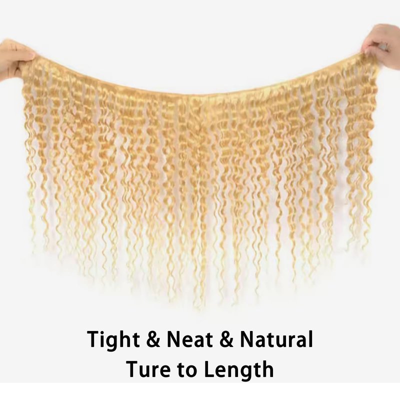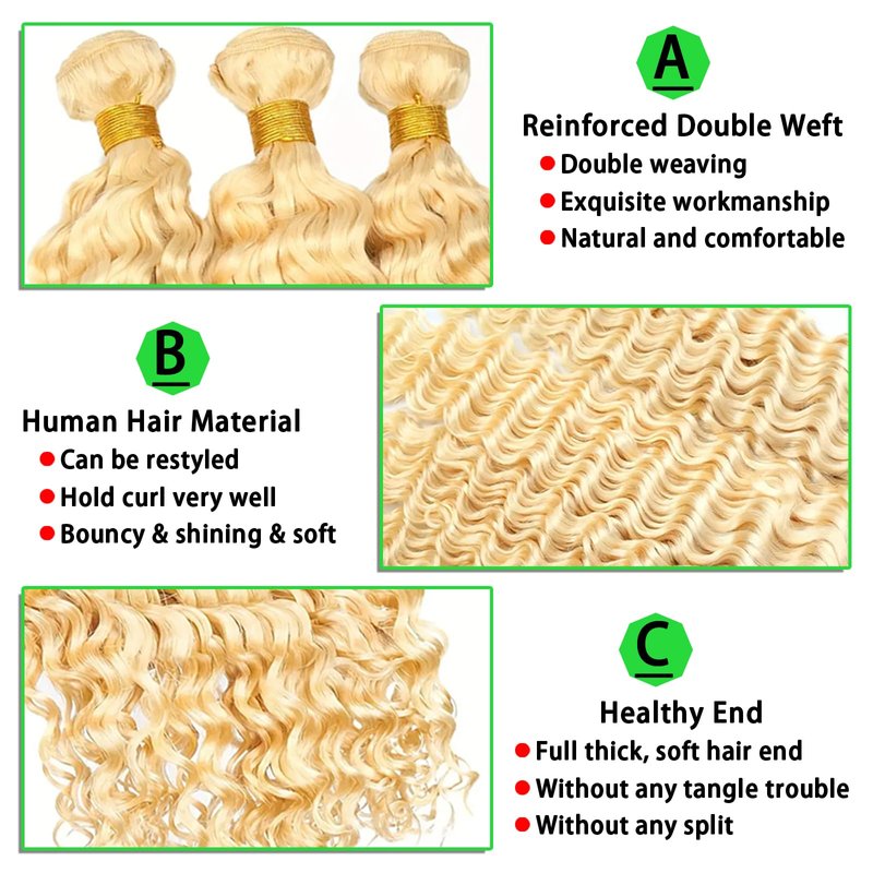 - 1.Hair Material : 613 Blonde Deep Wave Bundles Human Hair, Made from 100% virgin human hair.Double Machine Weft,Very Soft and Silky ,Tangle-free ,Minimal Shedding ,No Chemical Treatment ,No Smelling ,No Animal Hair Mixed,No Lices;Can be Dyed, Permed, Bleached,Curled or Styled as your own hair.