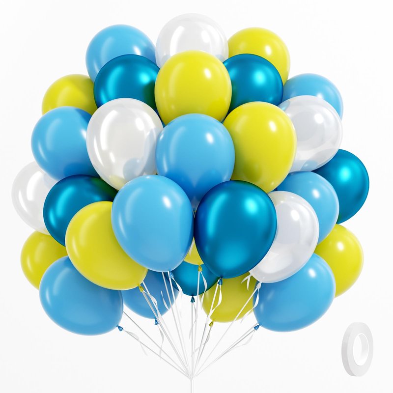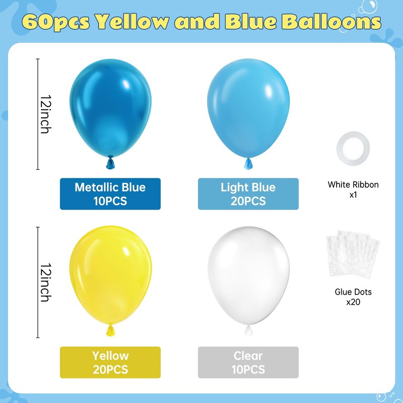 - Package Included: The blue and yellow balloons include 12inch light blue balloonsx20, 12inch yellow balloonsx20, 12inch clear balloonsx10, 12inch metallic blue balloonsx10, ribbonx1, glue dotsx20