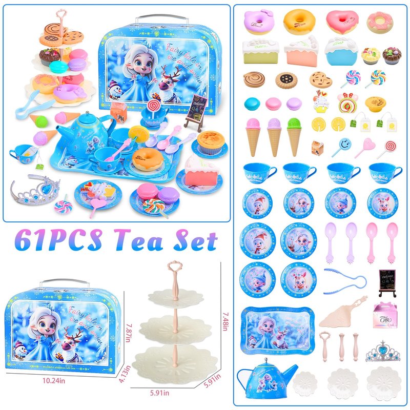 - 61 PCS Kids Pretend Tea Set:This Tea Party Set inspired by fairy tale in ice and snow toys, is designed for imaginative play, featuring whimsical elements that delight children. A crown adds to the experience, allowing kids to feel like princess. The girl toys includes a lidded teapot, plates, 4 teacups, spoons, a cake stand, and 40 delightful treats like donuts, cakes, lollipops, and cookies, sparking creativity and fun