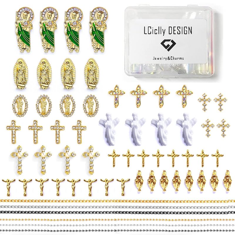 - 【Rhinestones Cross Nail Charms】 The latest luxury rhinestones cross, San Judas, Virgin Mary, Angel relief design. If you are a nail art lover, you must not miss this shiny religious nail charm set. Multi assorted shapes gold nail charms and 6pcs nail chains, make your nails more personality, which is very suitable nail art designer.