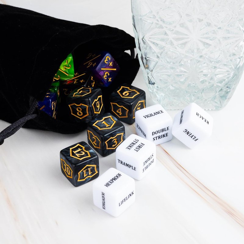- Package Include: Includes shield dice counters(5pcs 1~6 dice&5pcs 7~12 dice) and 10pcs white MTG keywords dice(FIRST STRIKE,VIGILANCE,MENACE,TRAMPLE,HASTE,DOUBLE STRIKE/LIFELINK,REACH,FLYING,HEXPROOF,DEATHTOUCH,INDESTRUCTIBLE), 20 pcs +1~+6 counters, 20 pcs -1~-6 dice counters,. There are also 3 pcs 20mm d20 dice.
