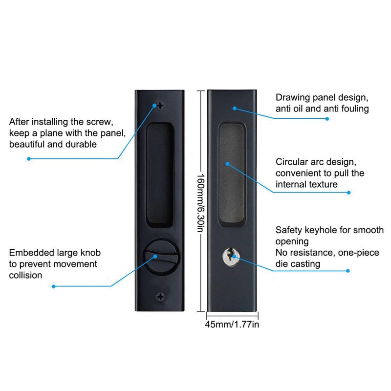 - 【CHOOS HIGH QUALITY MATERIALS】Sliding Pocket Door Lock is made of high-quality copper material, and the lock body of the pocket door lock is made of zinc alloy. The surface electroplating is smooth and feels excellent, without roughness. The design of anti-corrosion coating makes the door lock more wear-resistant, dirt-resistant and anti-corrosion. Dust, oil resistant and durable.