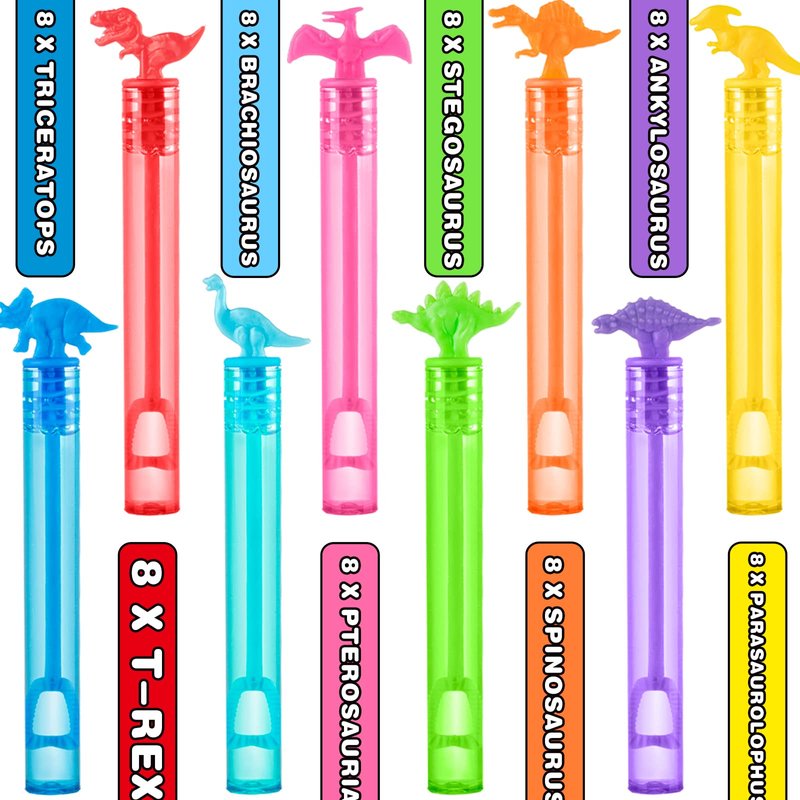 - BULK SET OF BUBBLES: Each set contains 64 packs of mini dinosaur bubble wands that have 8 different styles of dinosaurs with a charm dino theme design. They gives your kids endless hours of bubbly happiness.