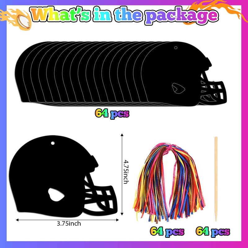 64 Pcs Football Scratch Paper Crafts Kit Football Themed Helmet Scratch Art Paper Cards Ornaments with Wooden Stylus and Ribbons for Classroom Party Painting DIY Crafts Supplies