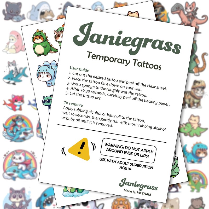 - [Usage] Lay your preferred design face down on a dry, clean surface. Next, gently pat the tattoo paper with a damp paper towel. After 10-20 seconds, take off the tattoo paper and enjoy!
