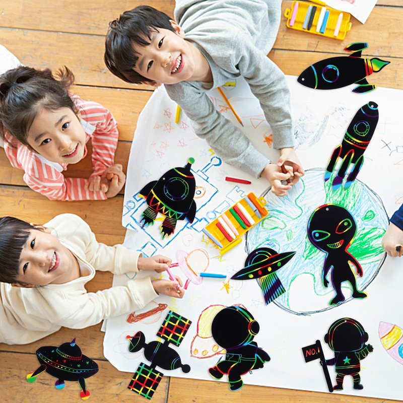 - Outer Space Themed Design: This rainbow scratch card art set features an outer space pattern, vivid and adorable, and can make you immersed in the wonders of the universe, scratch paper helps improve creativity while having fun and developing color recognition, space themed DIY scratch paper art set is wonderful kits for kids to enjoy their happy time.