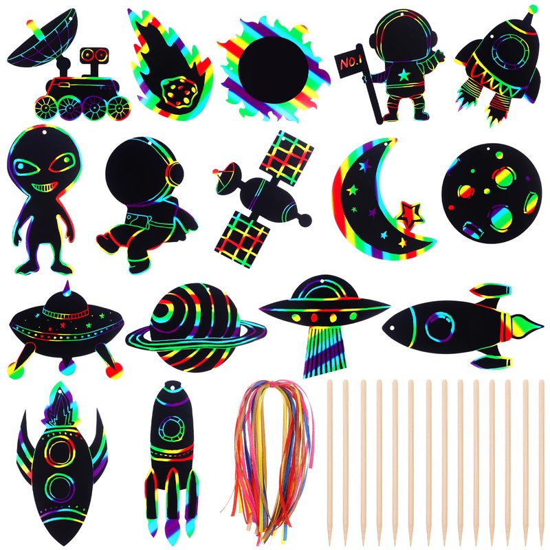 - Value Package: You will get 64 pcs outer space black scratch paper for kids in 16 styles, each of 4 pieces, 64 pcs wooden sticks, and 64 ribbons, with different sizes and shapes of scratch cards that can satisfy your needs of DIY crafts and as well as for gift giving needs.