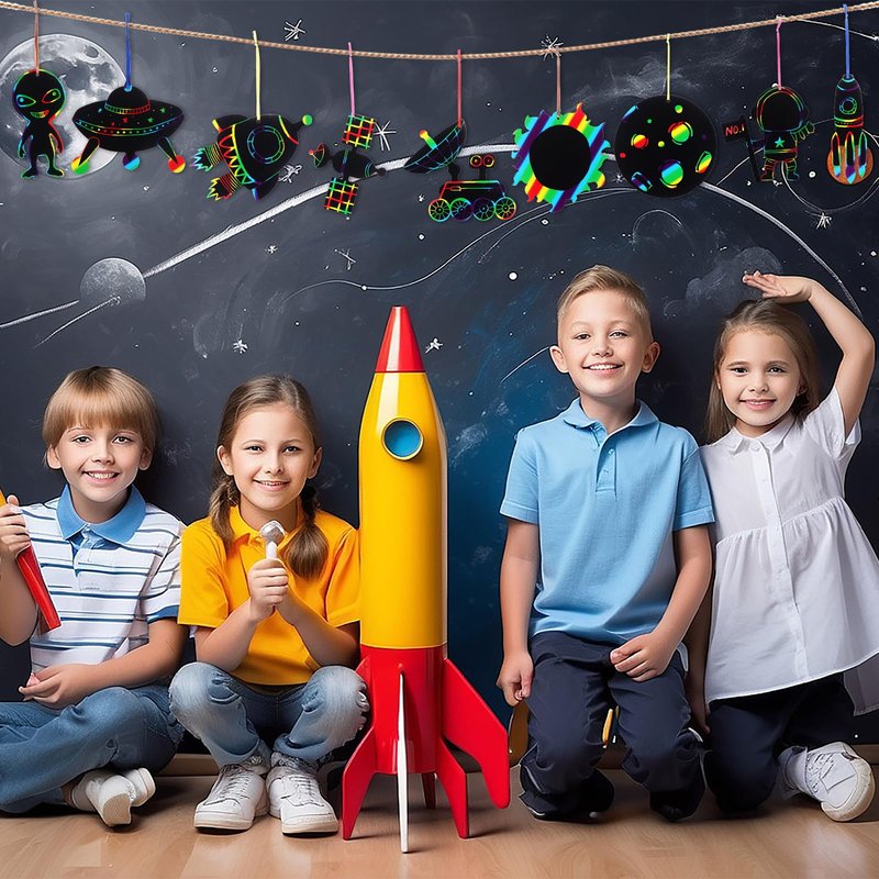 - Easy to Use: The magic scratch card is very easy to use, no need for colored pencils and paints, just a light scrape with a wooden stick, you can draw a colorful bookmark and rainbow color space themed pattern cutouts paper is designed with holes for easy threading of ropes, colorful ribbons can hang up your own paintings, you can also stick rainbow rocket scratch card on the wall as decorations to decorate your rooms.