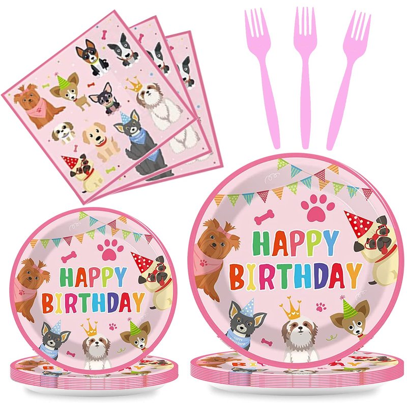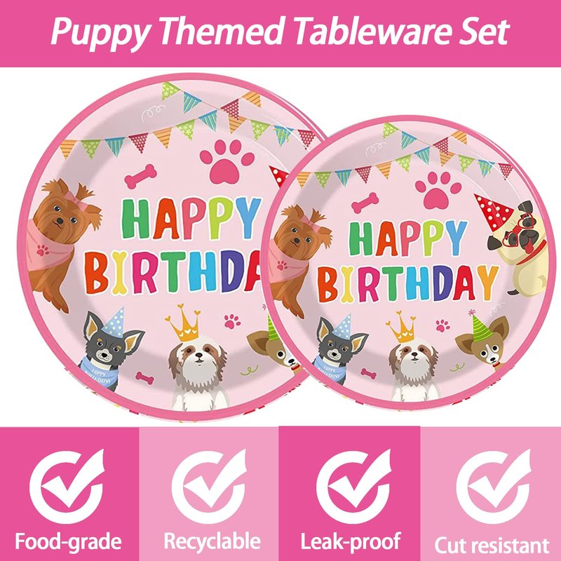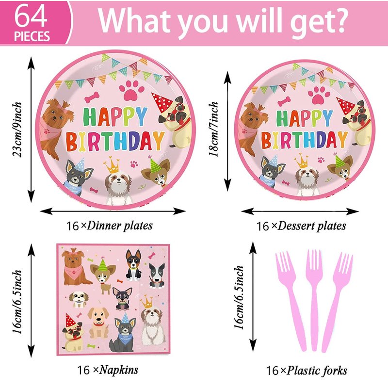 64pcs Dog Party Supplies,Puppy Birthday Party Tableware Set,Pink Puppy Face Plates Napkins Forks for Girls Kids Dog Puppy Birthday Paw Prints Party Decor,Serves 16