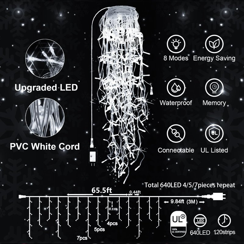 65 FT 640 LED Christmas Lights Outdoor Decorations Clear Wire String Lights Plug in 120 Drops 8 Modes Memory Timer Connectable Curtain Fairy Lights Waterproof for Holiday Wedding Party-Cool White