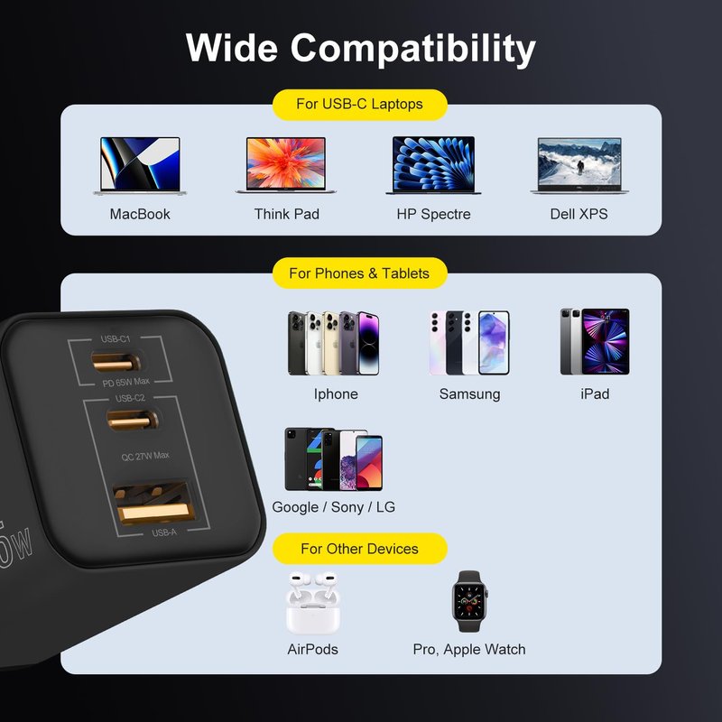 - ⚡【Universal Compatibility】: This usb c charger supports most fast-charging protocols (QC3.0, PD3.0, PPS, SCP, AFC, Apple 2.4). The 65W usb c charger is compatible with iPhone 14/Plus/Pro/Pro Max, MacBook Air, iPad Pro/Air/Mini, iPhone 13/13 Pro/13 Pro Max/13 Mini/12/12 Pro/12 Pro Max, and Galaxy, ensuring seamless compatibility.