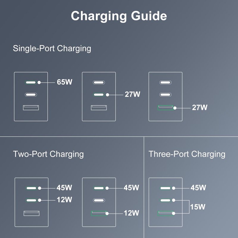 - ⚡【Multi-Device Charging】: This multi-port USB-C charger is perfect for powering up all your devices quickly. With its 65W power delivery and 3 USB ports, you can charge laptops, phones, and more simultaneously at top speeds. When you connect 2 devices, the USB-C1 port is preferred, and its output power is 45W, which can charge your devices more efficiently.
