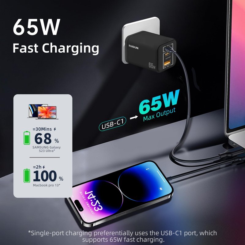 - ⚡【65W Fast Charger】: This 65w usb c charger can deliver a quick charge with up to 65W for your mobile devices including a wide range of no more than 65W laptops, tablets, smartphones, mobile devices, and more. Single-port charging preferentially uses the UsB-C1 port, which supports 65W fast charging. 65w usb wall charger can charge SAMSUNG Galaxy S23 Ultra to 68% in 30 mins, and can fully charge Macbook pro 13 in 2H.