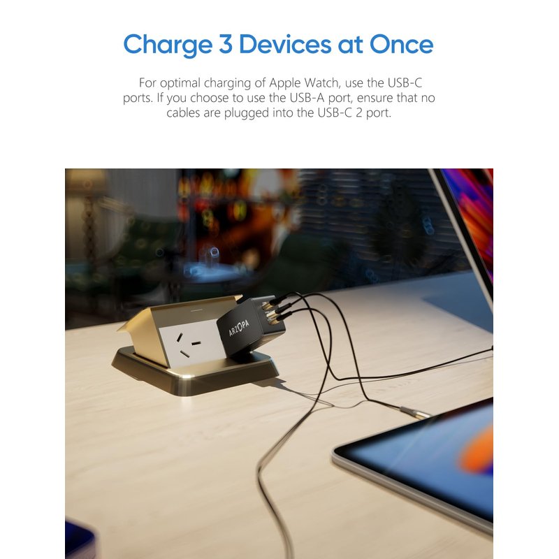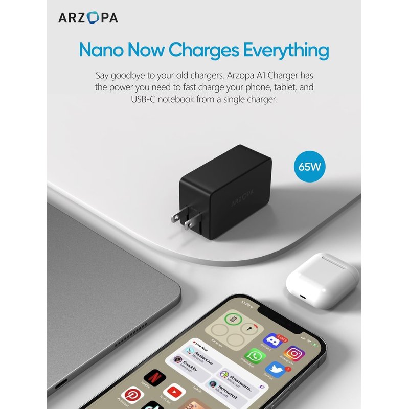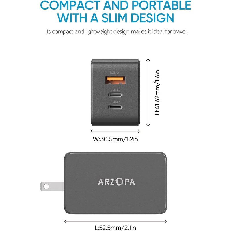 65W USB C Charger Block, ARZOPA GaN Fast Charger USB C Wall Charger PPS 3-Port Foldable Plug for MacBook Pro/Air, iPad Pro, iPhone 15/Pro, Galaxy S24 Ultra, Dell XPS 13, Pixel, Monitor