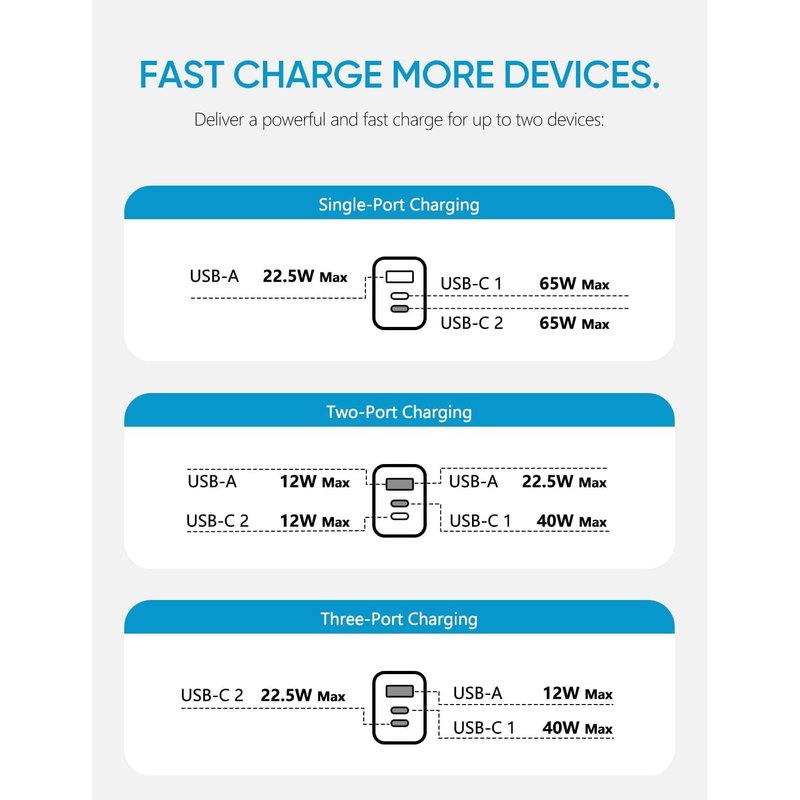 - SUPER FAST CHARGING: When you connect a single device, you can experience super fast charger with a maximum power of 65W. Both the C1 and C2 ports deliver an impressive 65W each, while the A1 port provides a still-speedy 22.5W. Get your devices powered up quickly with this high-speed charging solution
