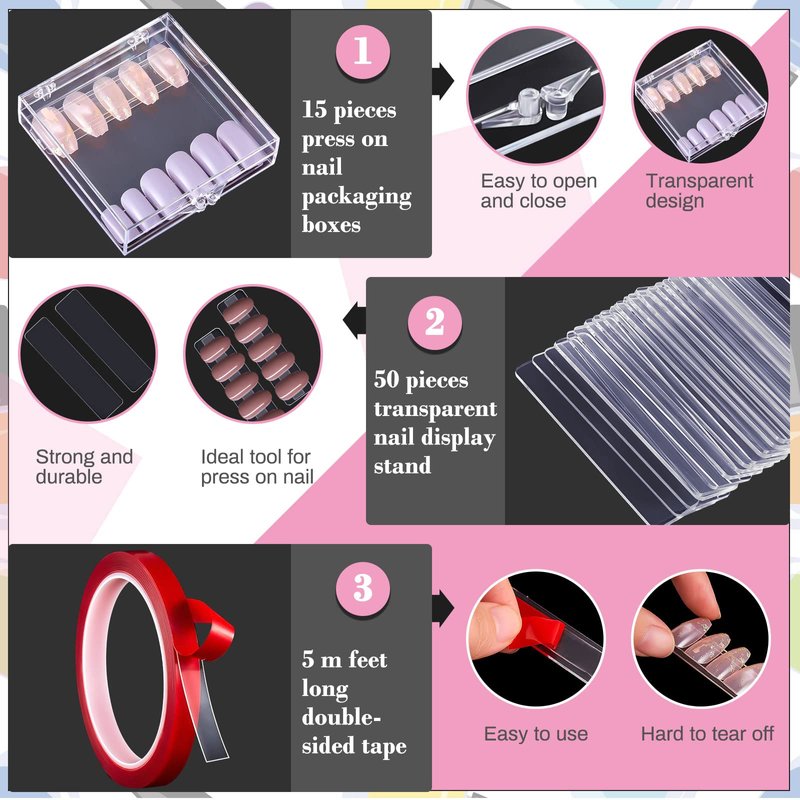 - Sufficient Combination Set: the package includes 15 pieces nail tip display boxes, square and transparent, 50 pieces transparent press on nail stands and a roll of nail tape for press on nails, sufficient quantity, nice combination, proper for you to meet daily nail tips storage needs, keeping them neat, clean and tidy, also suitable for small business, retailers, boutiques and salons; Please note that the package doesn't contain nail tips