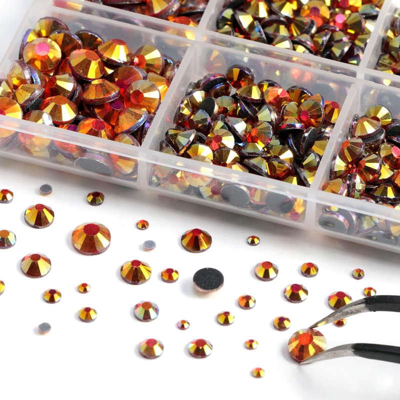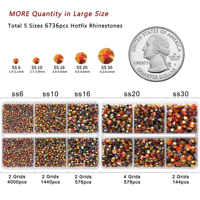 - Pack of 2 boxes, total 6736 pieces orange ab hotfix rhinestones in 5 sizes,one tweezers and two wax pencil for rhinestones.A cost-effective choice, suitable for beginners to practice.