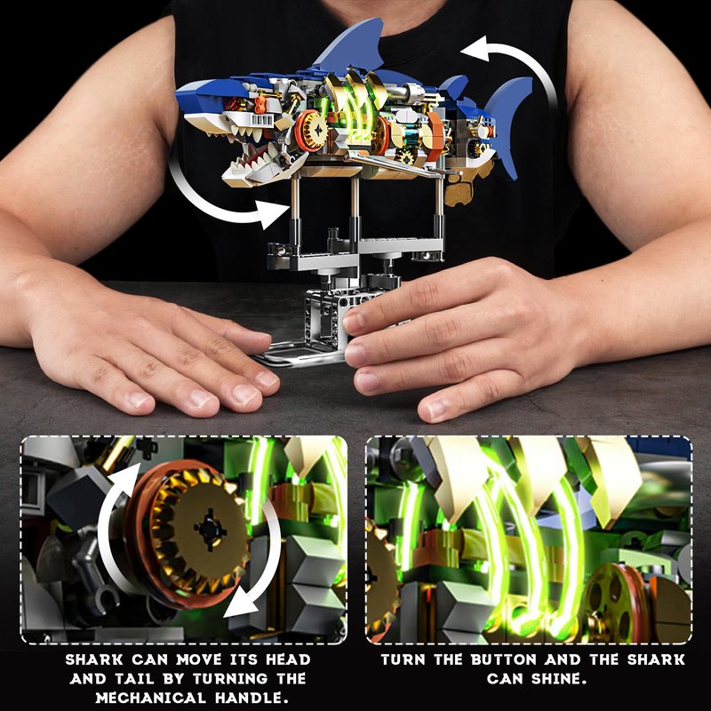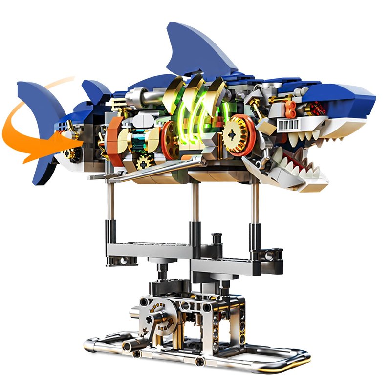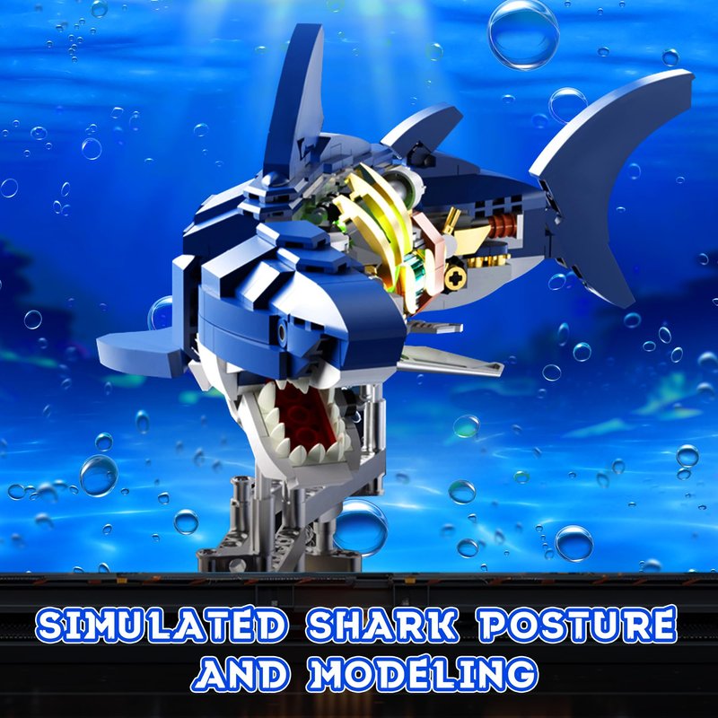 - Luminous Shark Block Toy: The shark building block set consists of three movable joints; Turning the knob on the base can make the shark's head, body and tail move, as a shark swimming in the sea