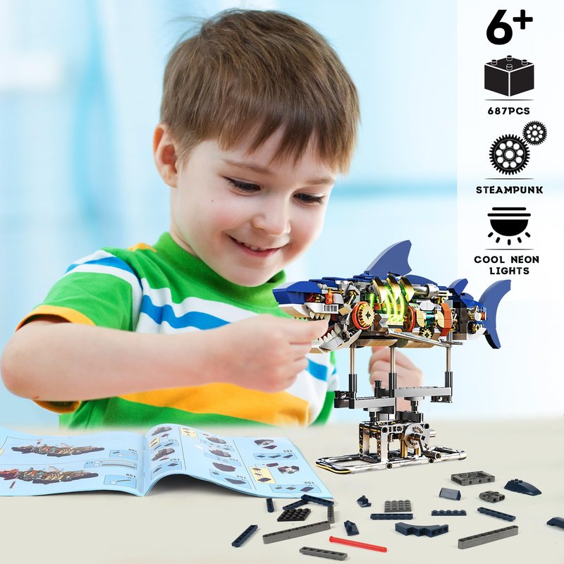 - Punk Mechanical Shark: The mechanical shark building block toy is a semi-mechanized design, metal base bracket and internal gears bring a full steampunk style, and the neon lights on the shark's side will light up in the dark