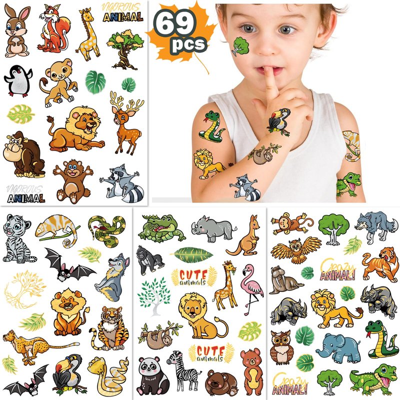 69 pieces Temporary Tattoos for Kids boy girl, Metallic Style, include cute lion, panda,deer, penguin, zebra, flamingo, giraffe, owl, monkey, tiger, bear, leopard, chameleon, kangaroo, hippopotamus, crocodile, rhino, walrus, koala, gorilla, toucan, fox and leaf, tree plant. An great gift for animals and zoom theme lover, Birthday Supplies Baby Shower.