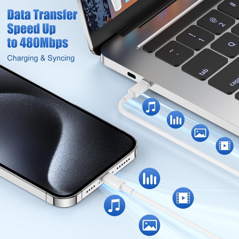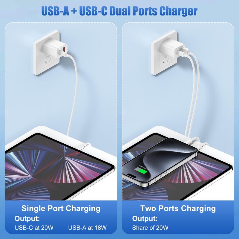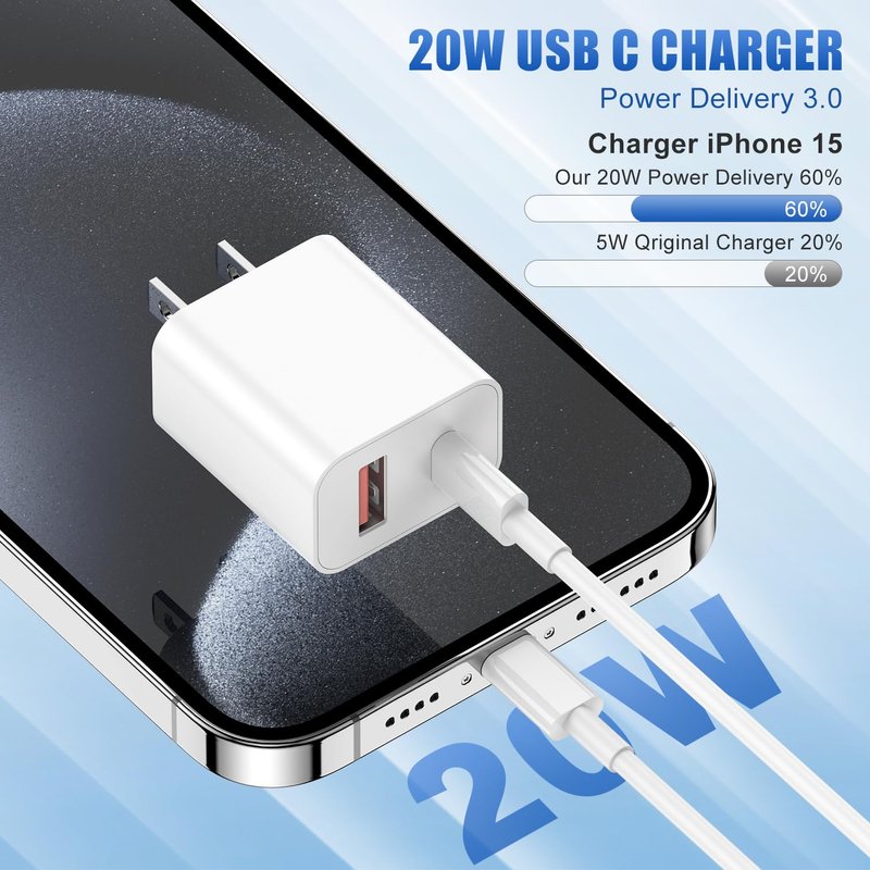 - [High-Speed Charging & Dual Port Design] The fast charger block, with an output power of 20W, featuring USB-C and USB-A ports, frees you from the clutter of various interface chargers. It enables simultaneous high-speed charging of two devices. Your iPhone 15 can be charged up to 60% in just 30 minutes, which is 75% faster than the ordinary 5W charger, saving you over 1.5 hours.