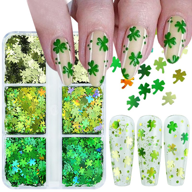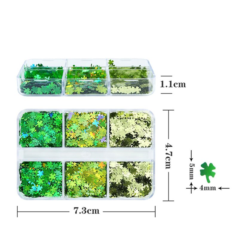 - ☘️Package: 1boxes of St. Patrick’s Day clover nail glitter, including 6grids green series of shamrock shaped sequins, each color with independent space packaging, easy to use and carry.