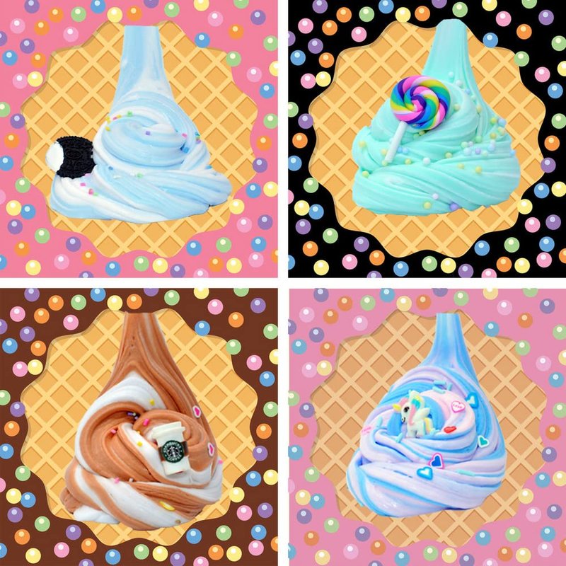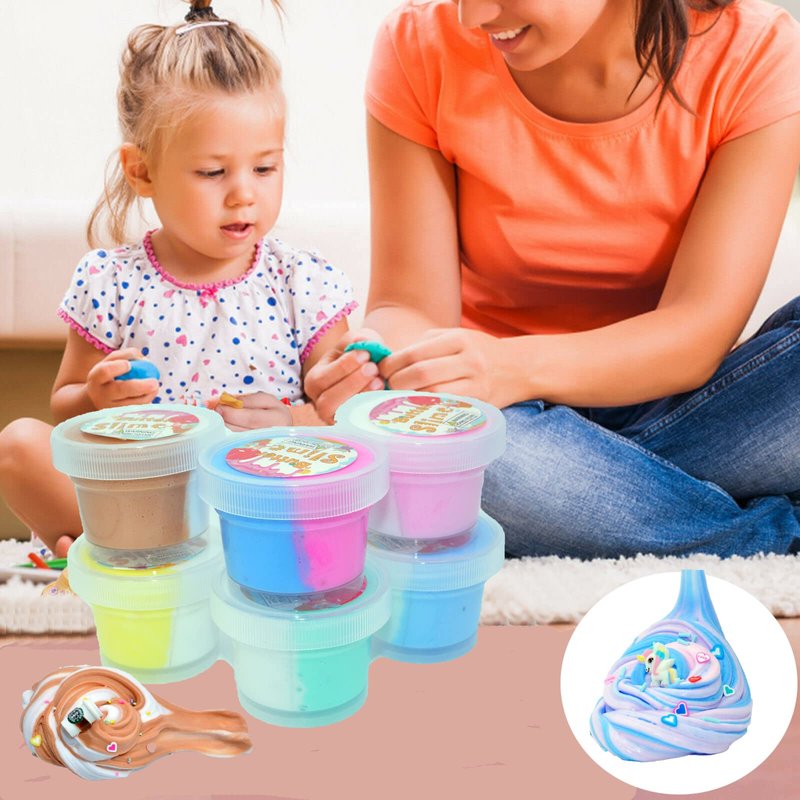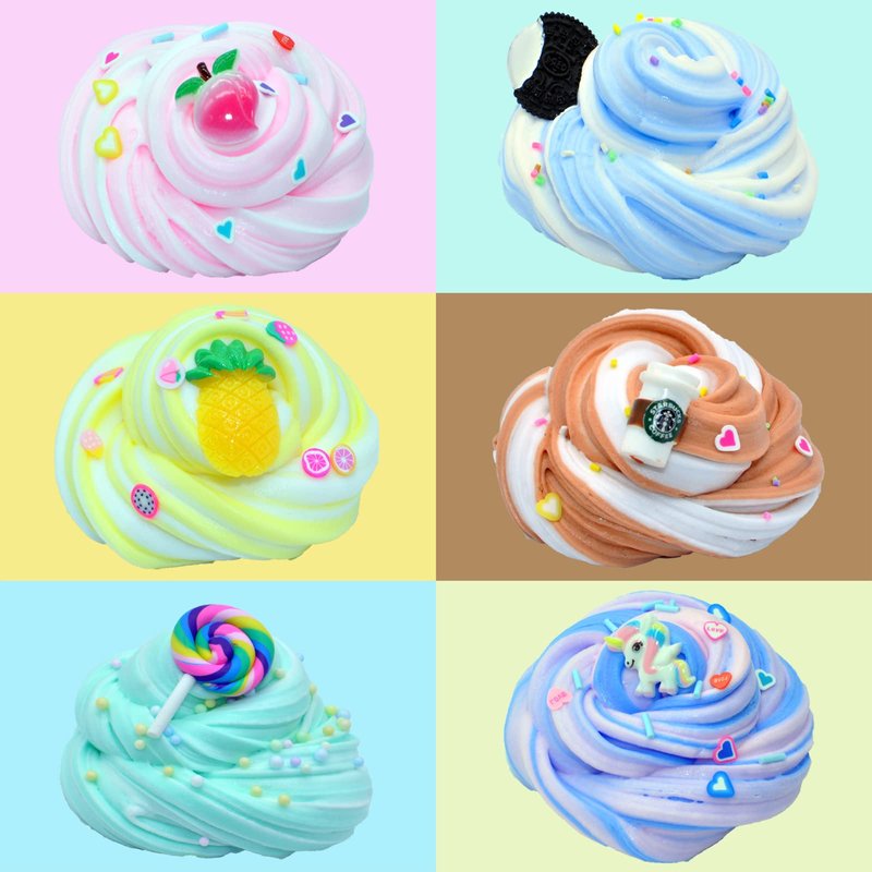 - *You will get 6 jars Dual Color Butter Slime with Cake,Fruit,Coffee Cup Charms etc.