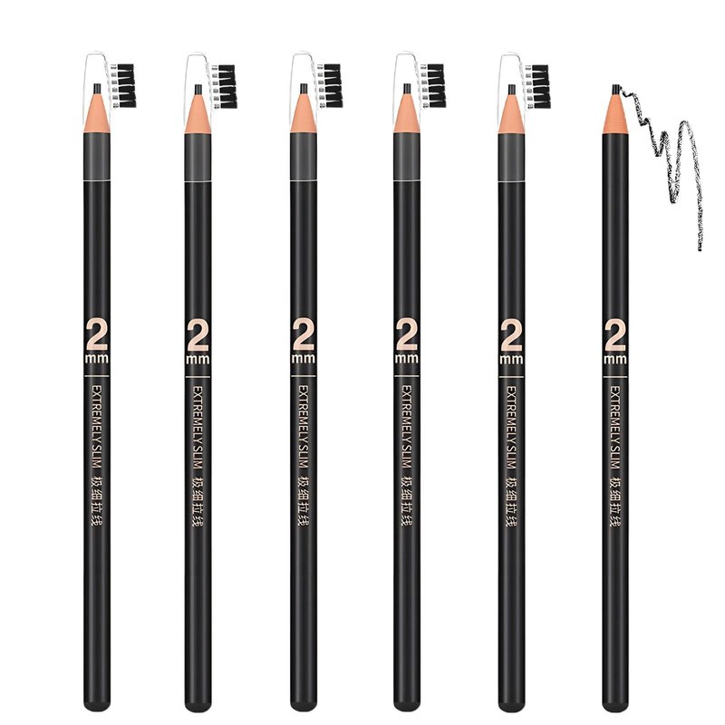 6pcs 2mm Ultra-Thin Eyebrow Pencil with Brush Waterproof Long-Lasting Slim Eyebrow Pencil Peel off Microblading Mapping Pencils (#01 Black)